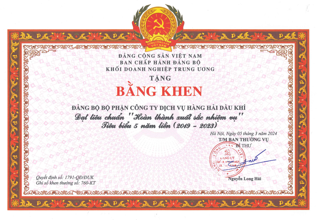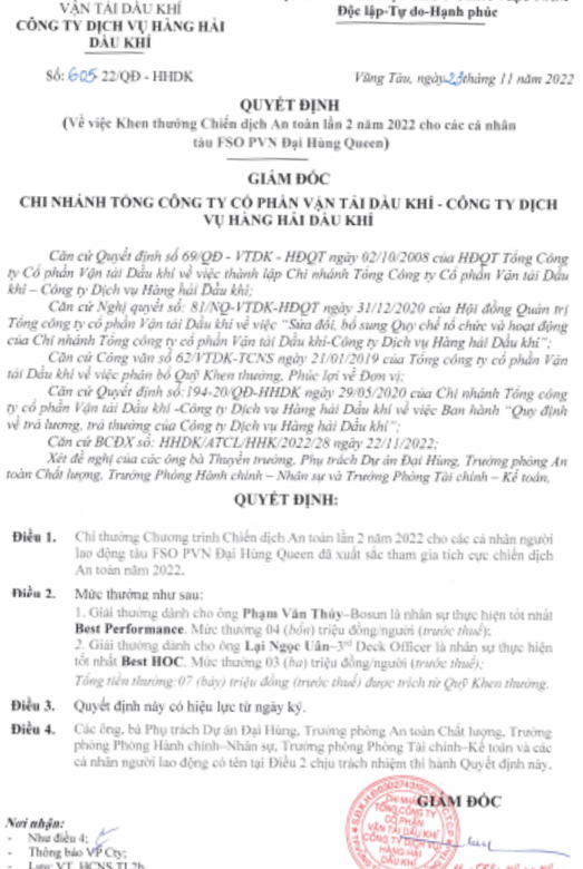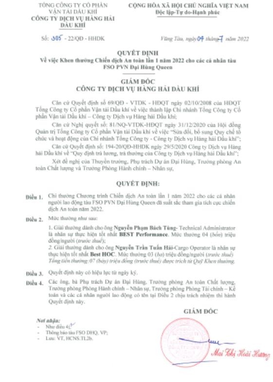 Tháng 10 năm 2022: Hoàn thành dịch vụ vận hành và bảo dưỡng cho tàu FPSO LEWEK EMAS tại mỏ Chim Sao cho khách hàng Premier Oil Vietnam Offshore.